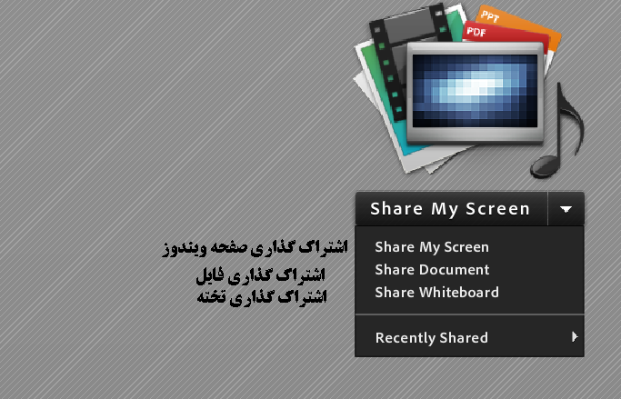 ارائه دهنده، استاد و یا مدیر جلسه می تواند علاوه بر اشتراک ویدئو خود با استفاده از گزینه اشتراک (صفحه نمایش، وایت برد، فایل همچون ورد و یا پاورپوینت و عکس و … )را با دانشجویان و شرکت کنندگان به اشتراک بگذارد.